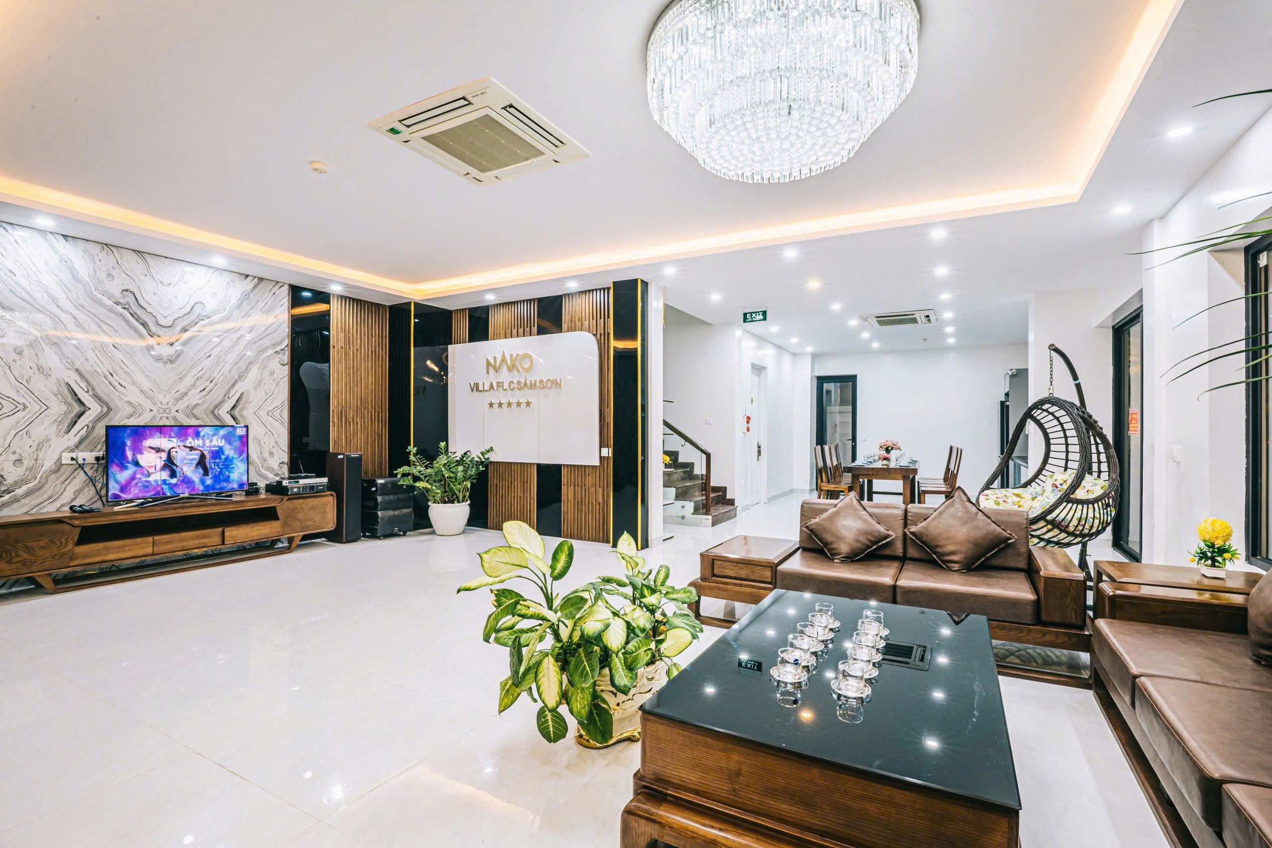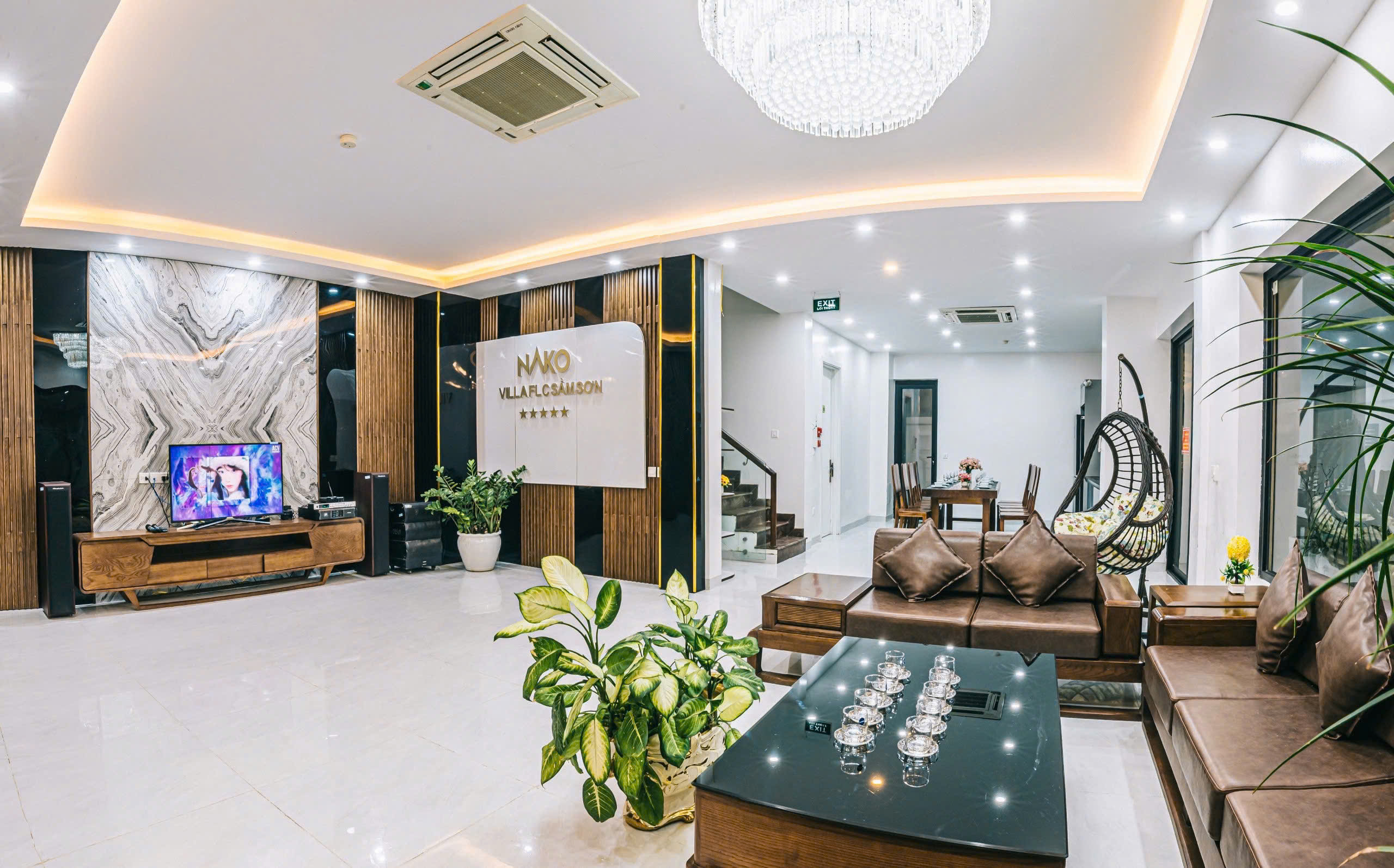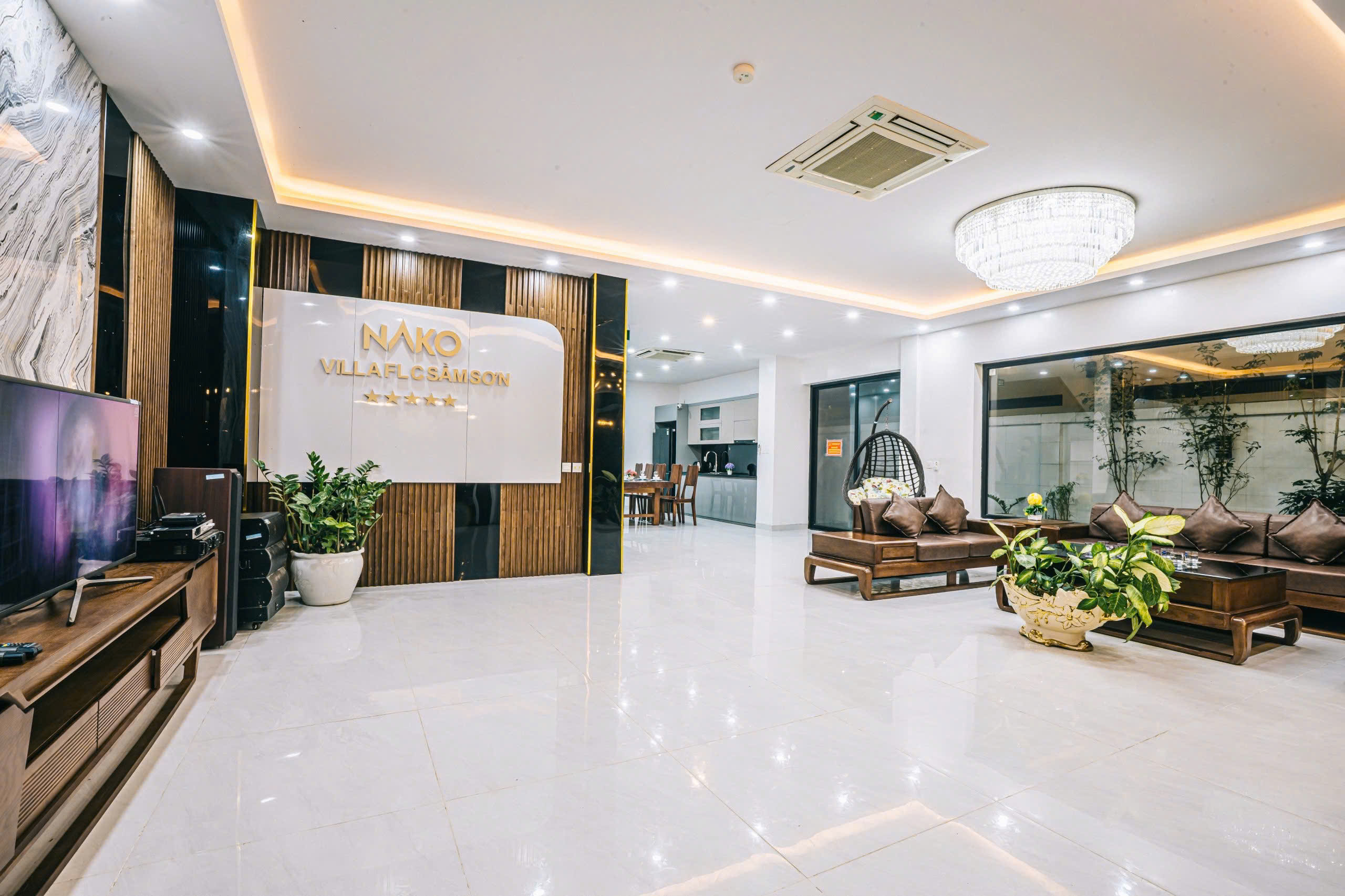 ✓ 01 Phòng khách lớn: Trang bị bộ Sofa sang trọng, TV 50 inch, điều hòa, quạt cây và hệ thống âm thanh cao cấp.