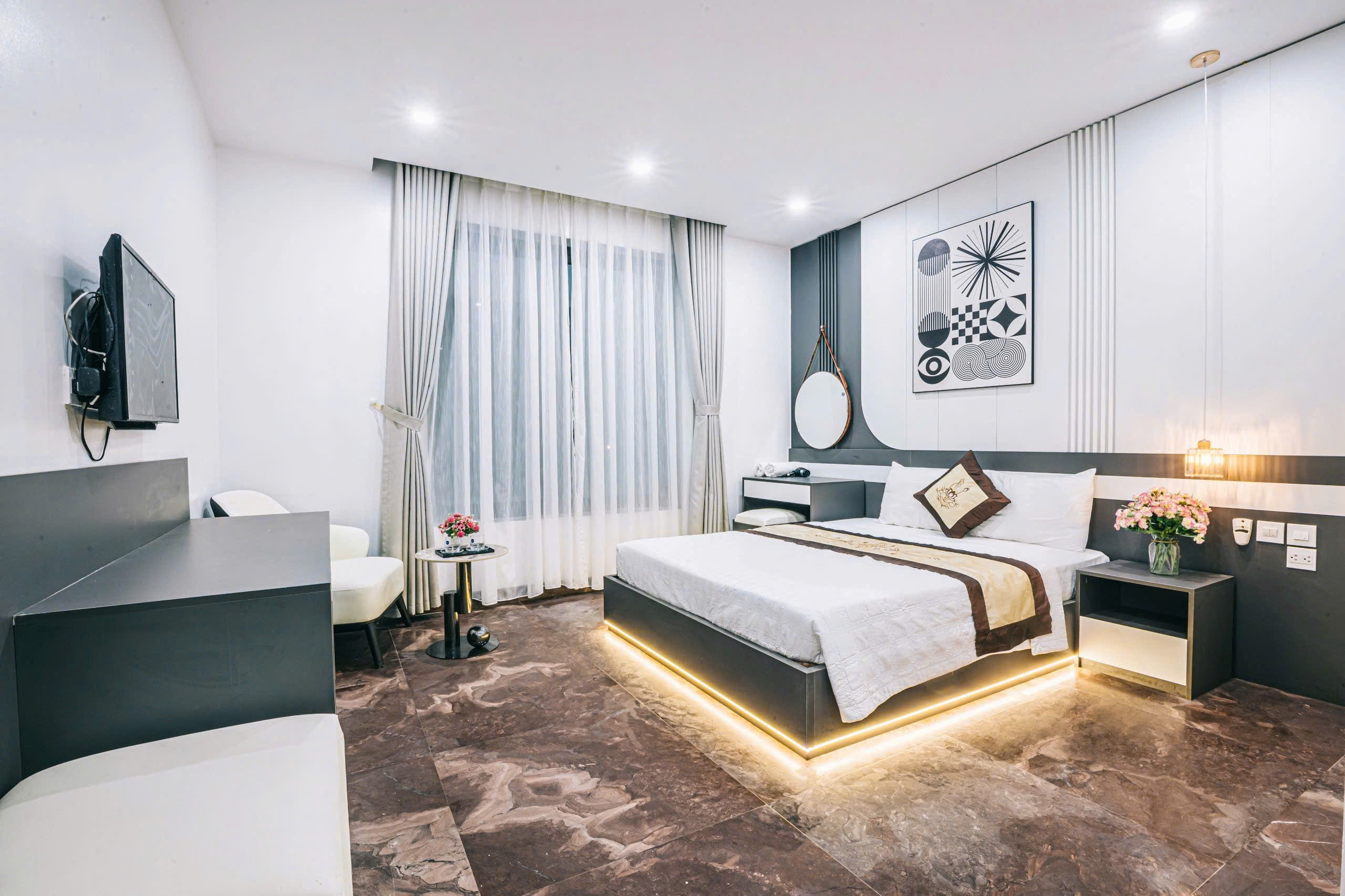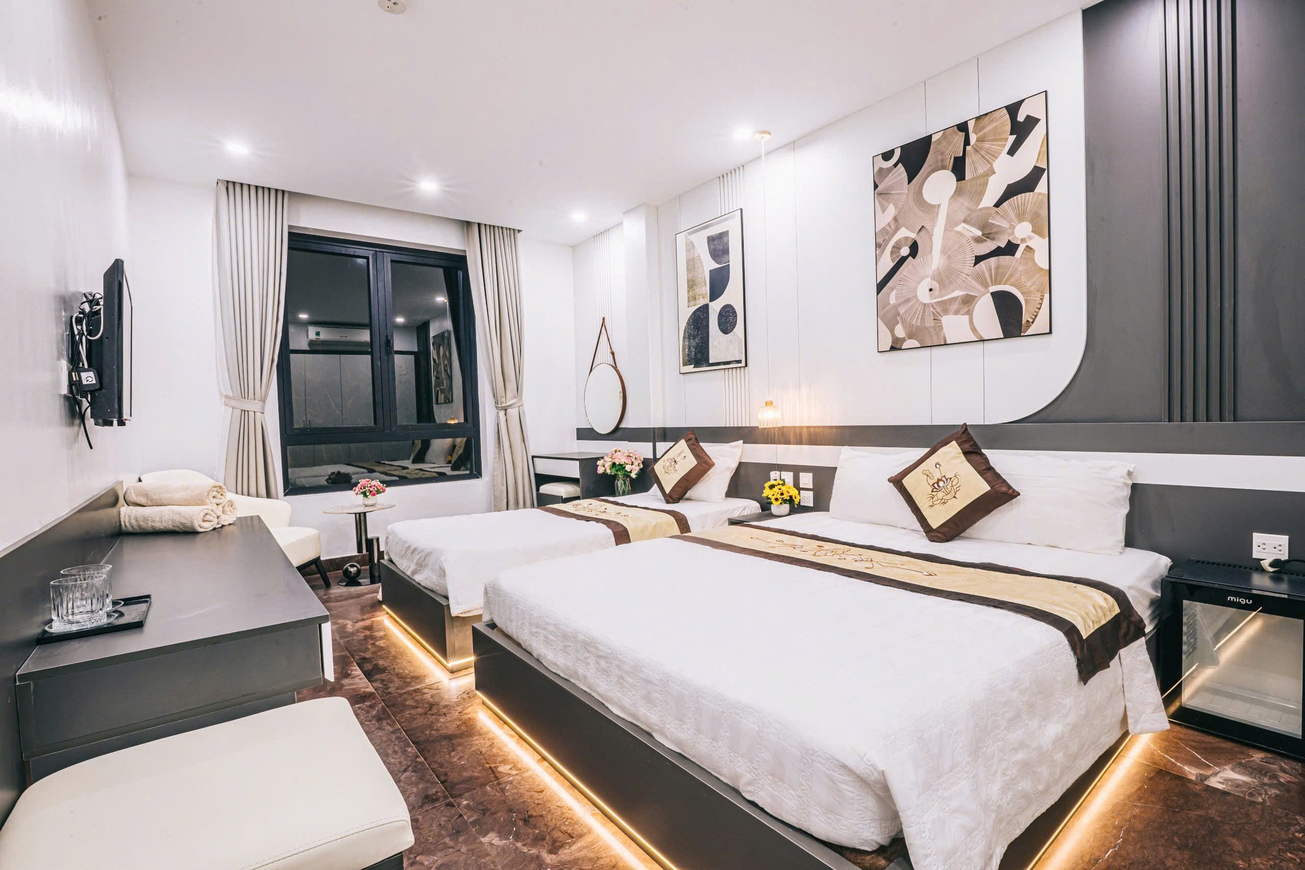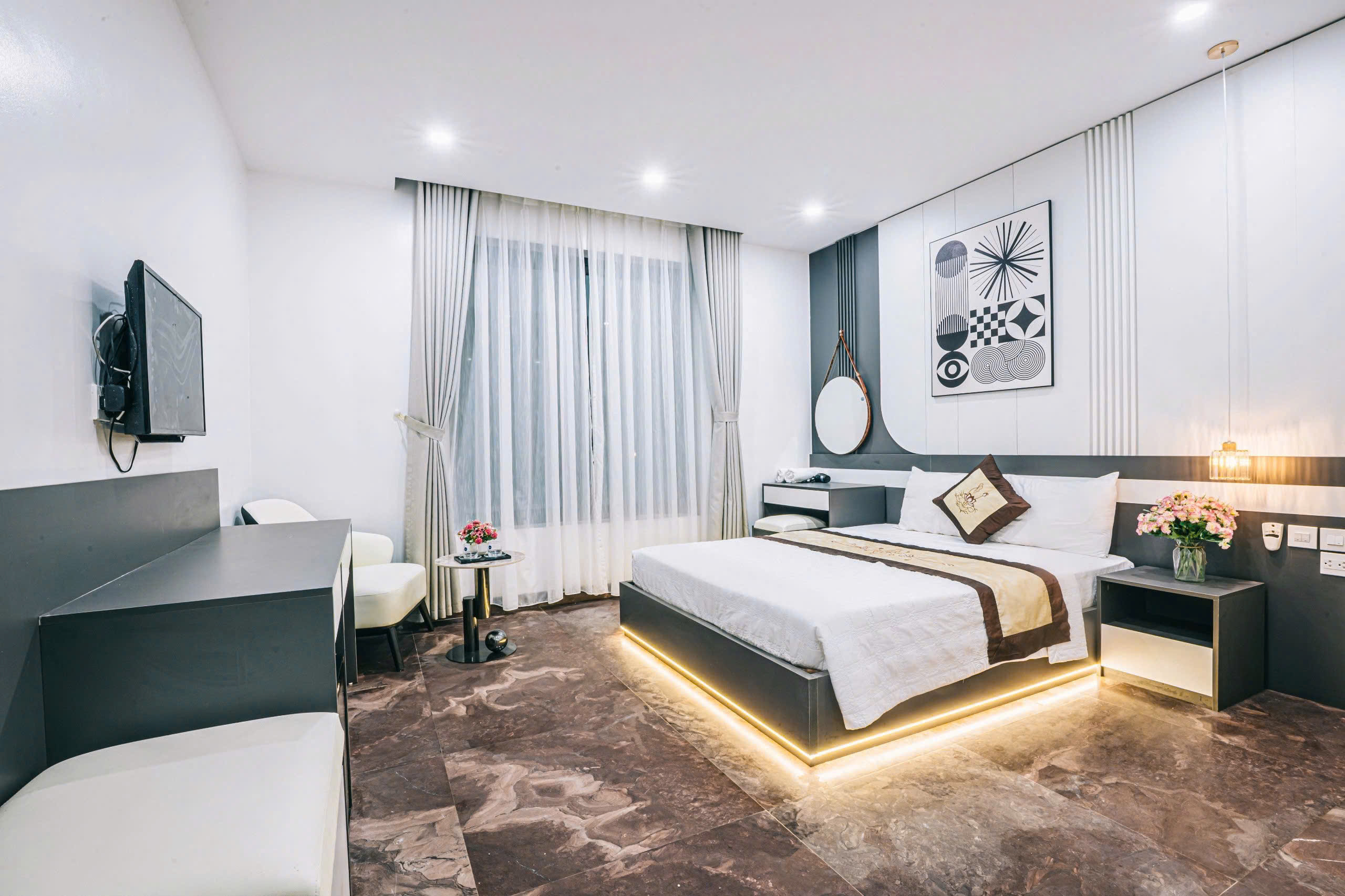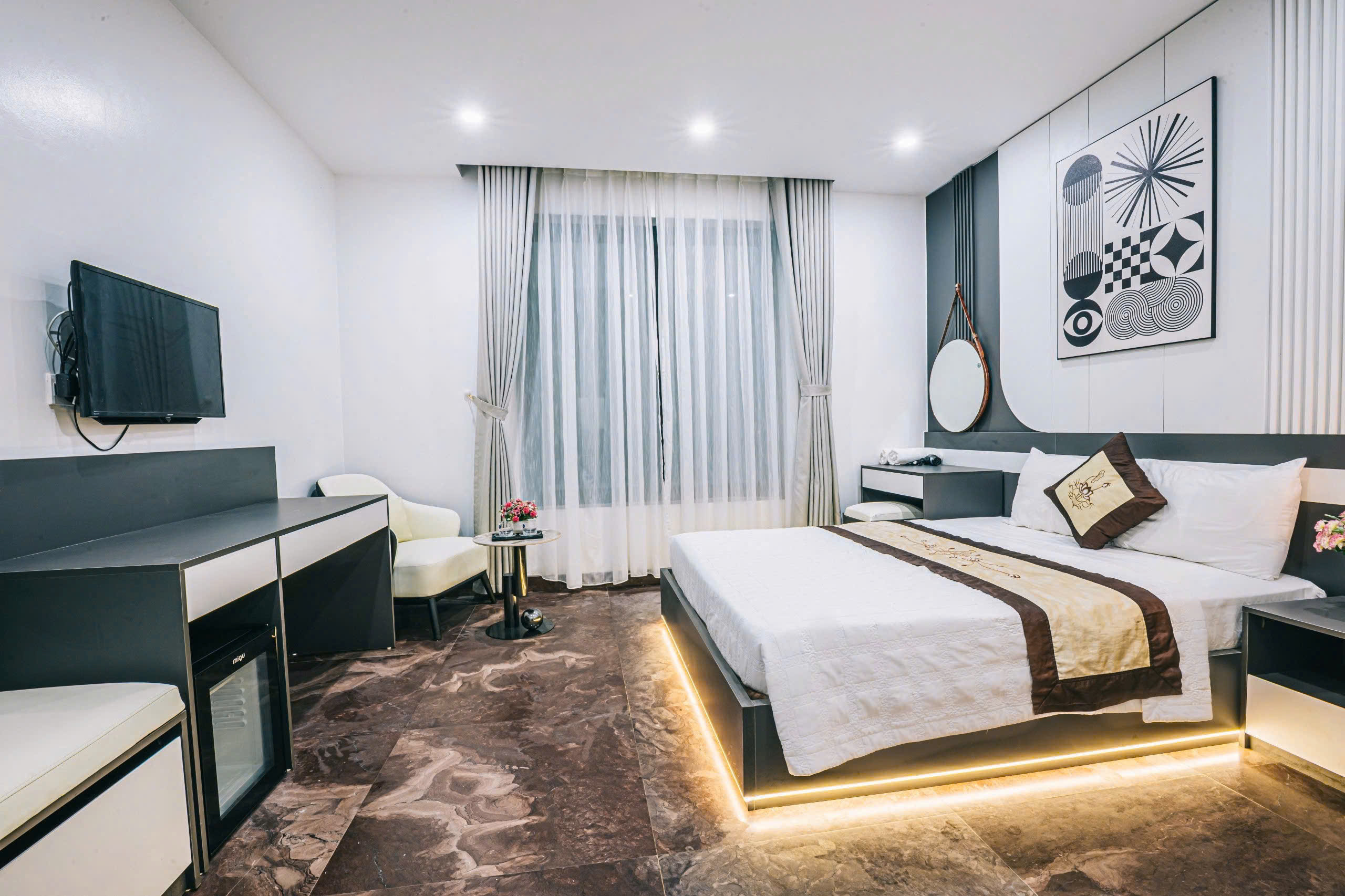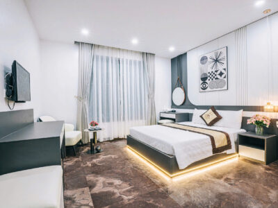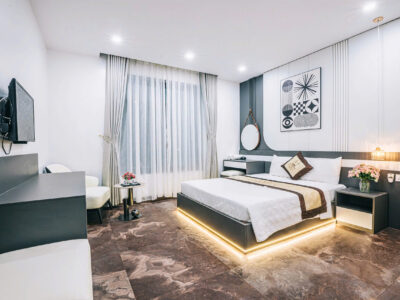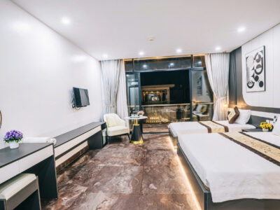 + Các phòng ngủ có ban công, nhà vệ sinh riêng, đều có: tivi, tủ lạnh, điều hòa, quạt, bình nóng lạnh, đồ dùng cá nhân…