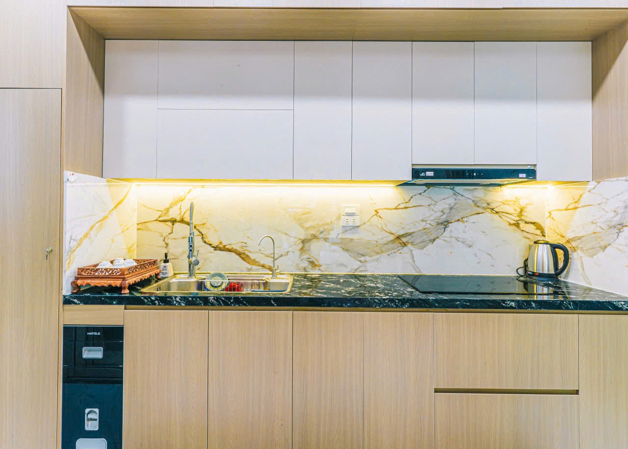 ✓ Phòng bếp tiện nghi: Trang bị tủ lạnh 2 cánh dung tích lớn, đầy đủ bát đũa, nồi chảo và dụng cụ nấu nướng.